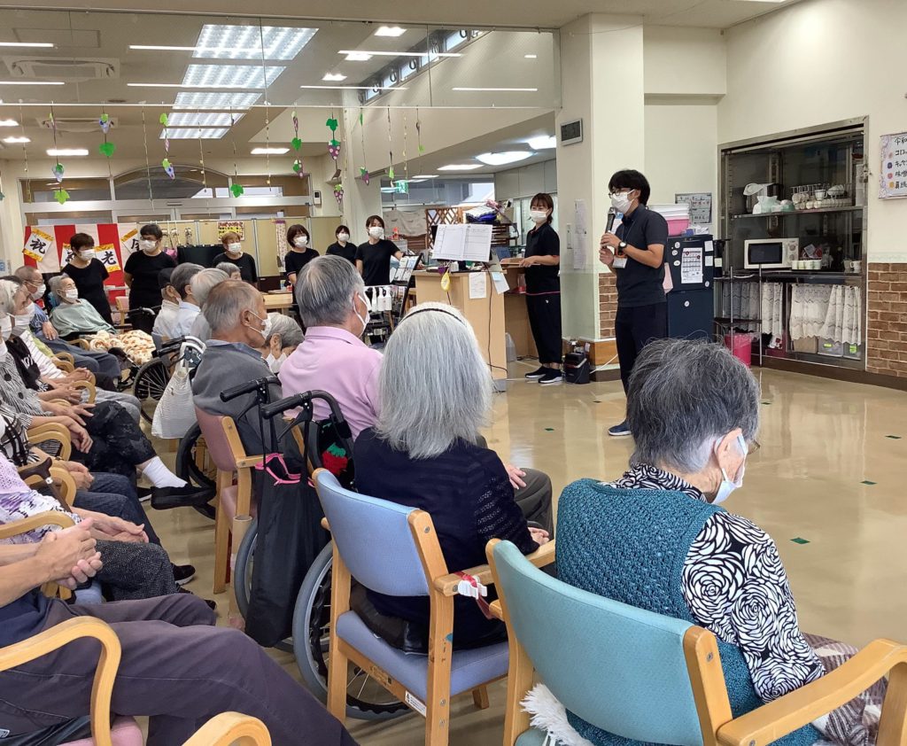 サービス 敬老会を開催しました(デイ鶴寿園) 2025.10.27 先日、日頃の感謝と長寿の願いを込めて「敬老会」を開催しました。管理者よりご利用者様への日頃の感謝と長寿のお祝いの言葉を贈呈させていただき、記念年の表彰を行いました。今年は百寿のご利用者様をはじめ14名のご利用者様が表彰となりました。その後は職員によるダンスと二人羽織、ご利用者様によるカラオケ、カルタ大会!!会場全体が笑顔と活気に包まれました。これからも笑顔あふれる毎日を、改めて皆様のご長寿を心よりお祝い申し上げます。 敬老会を開催しました。(岩木デイ) 前の記事