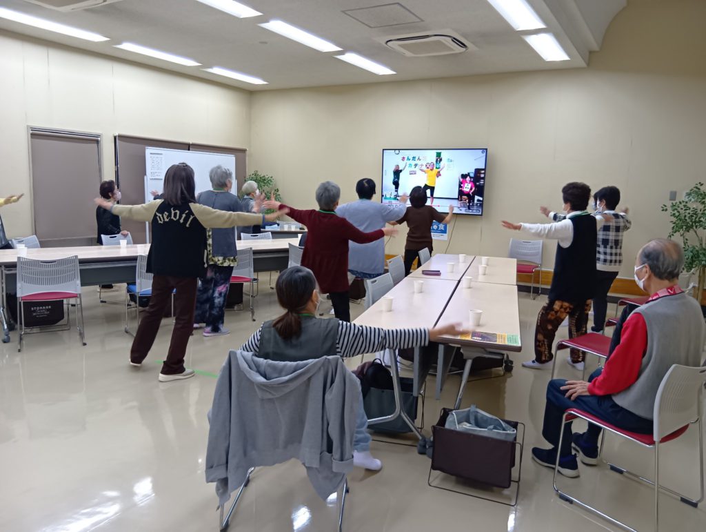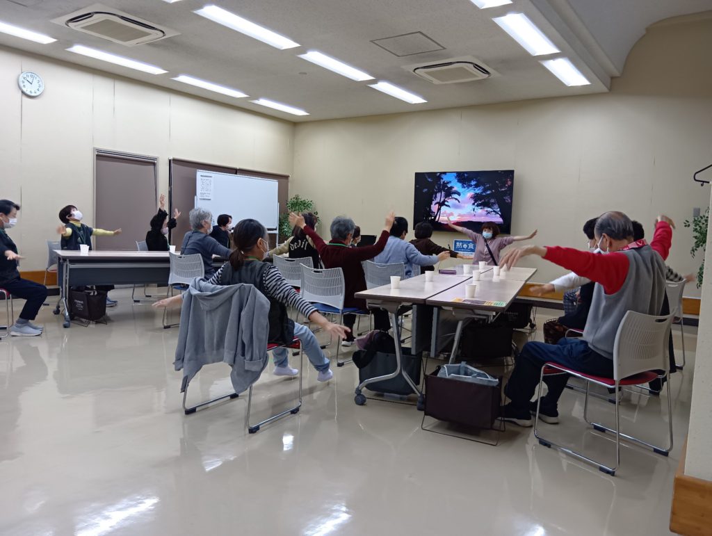 椅子に座って、ゆっくりとストレッチで体を伸ばします。その後、ラテン系の音楽に合わせて、楽しくからだを動かし、温まったところで準備完了です。