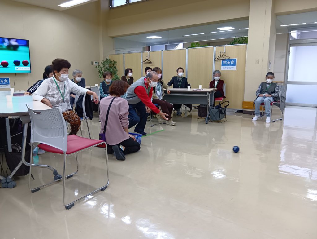 これまでも何度か行ってきた「ボッチャ」。今回が初めての方もおり、始めに練習。その後、赤・青チーム、交互にボールを投げ、点数を競いました。「何度やっても、こつがわからない」との声もあり、的から転がりすぎたり、届かなかったりと苦戦。中には1人で5得点あげる方もおり、一喜一憂しながらも集中して取り組みました。結果は、18対8で赤チームの勝利!赤、青チームともに万歳をして締めくくりました。