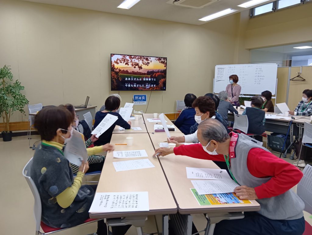 「里の秋」を皆様で歌いました。最後に声を出してすっきり。日本語の美しい歌詞、内容を映像と共に味わいました。
