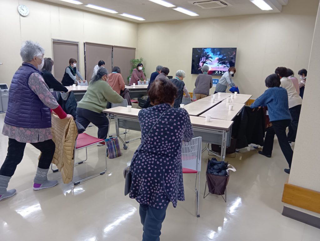ゆったりとした音楽に合わせて、ストレッチを行いました。寒さに縮まった体を伸ばし筋肉をほぐすと、血流が良くなり体が温まりました。