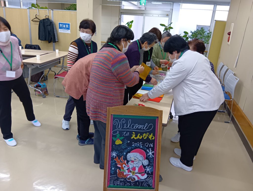 12月16日(火)、特別養護老人ホーム鶴寿園(ユニット型)の地域交流室で、令和7年度第9回「えんがわ」を開催しました。本格的な冬の寒さの中でしたが、17名元気な女性陣が集まり、にぎやかな「女子会」のような楽しいひと時となりました。