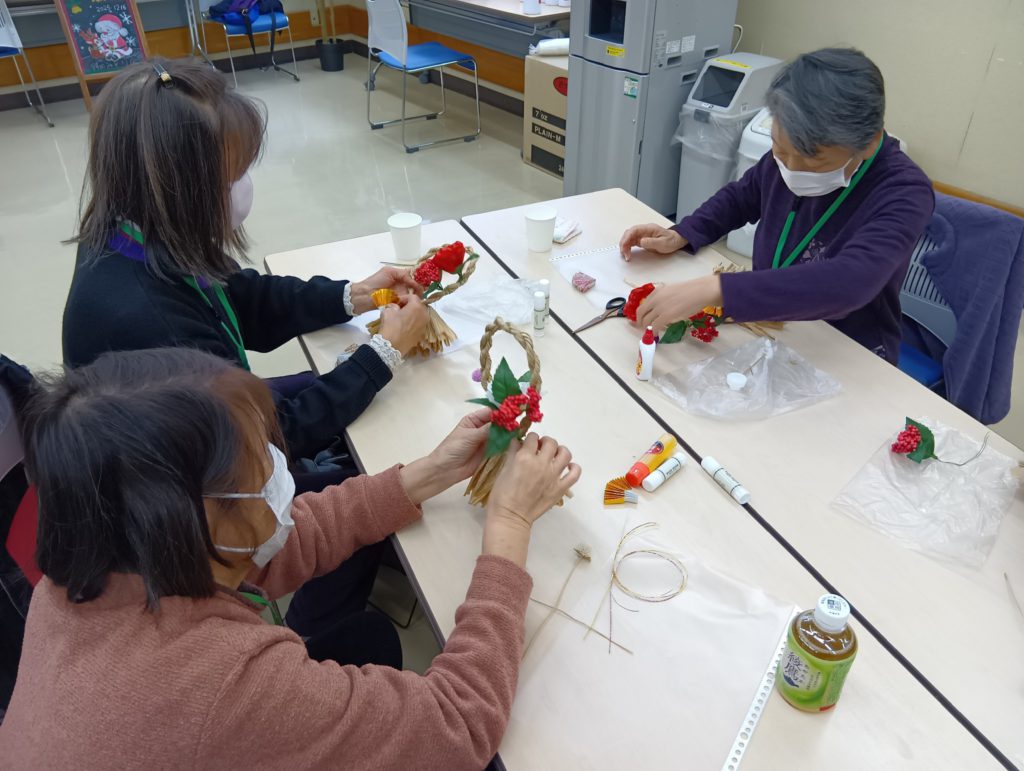昨年も好評だったお正月飾り作り。今年は1回コースでの完成を目指し、土台となるしめ縄をあらかじめ準備してスタートしました。