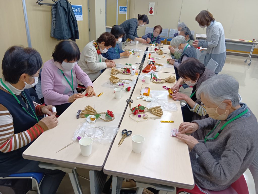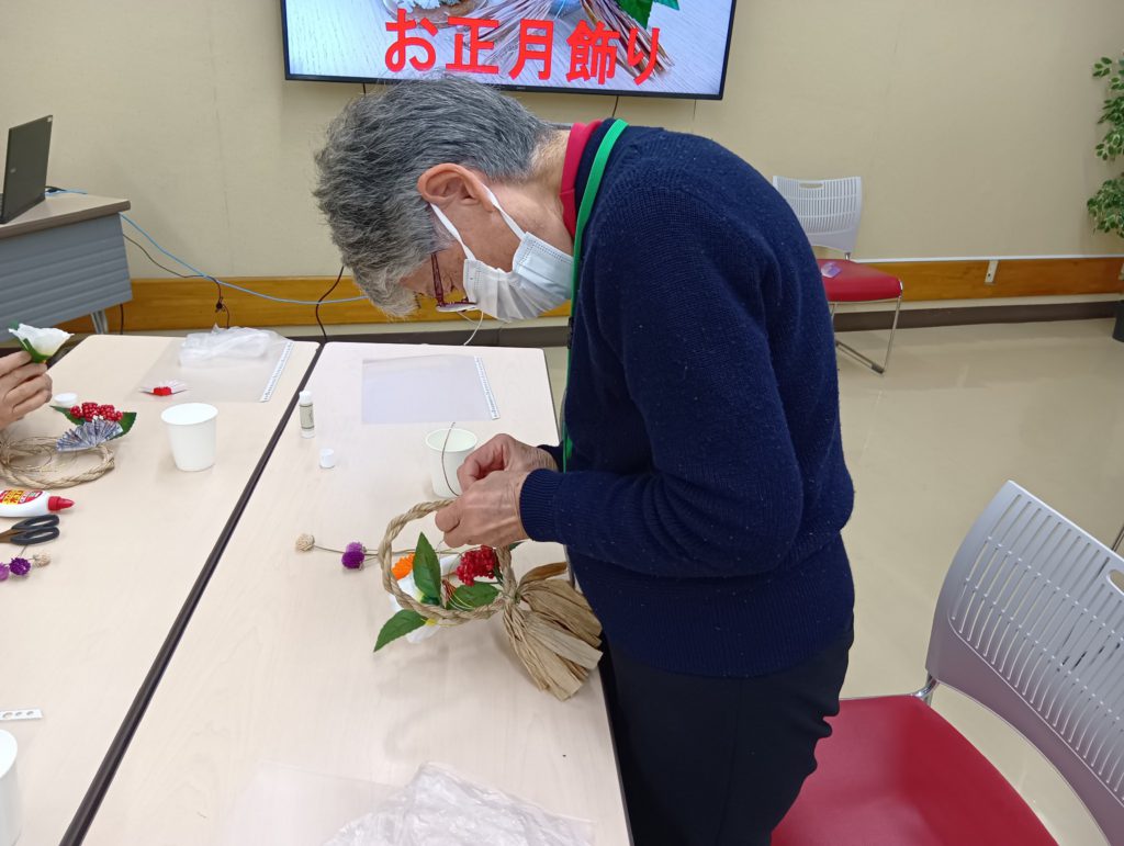 まずは飾りとなる「扇」作りです。色や模様の組み合わせを考え、折り紙を選ぶところから個性が光ります。テーブルごとに協力しながら、素敵な扇を折り上げました。 続いて、お好みで形を作る水引、椿や南天の造花、ドライフラワーをしめ縄に取り付けていきます。接着に時間がかかったりと苦戦する場面もありましたが、皆様無事に完成!「自宅でさらに飾りを足してみるわ」と、皆様嬉しそうに持ち帰られました。