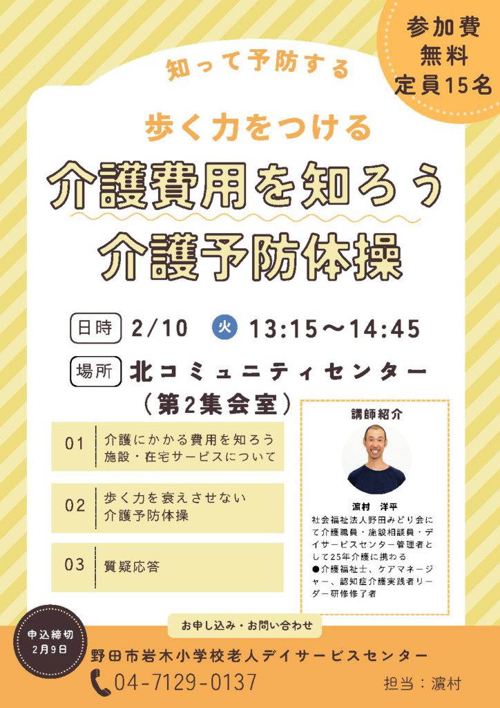 サービス 講習会のお知らせ(野田市岩木小学校老人デイサービスセンター) 2026.01.22 講習会「介護にかかる費用を知ろう、介護予防体操」を、2月10日(火)、北コミュニティセンター第2集会室にて開催します。 参加費は、無料です。内容は介護にかかる費用の講座と介護予防体操です。 参加希望の方は、2月9日(月)までに、野田市岩木小学校老人デイサービスセンターに電話にて、申込みをお願いいたします。皆さまの参加をお待ちしております。 えんがわのお知らせ(野田市東高齢者なんでも相談室) 前の記事