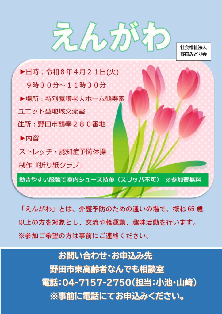 サービス えんがわのお知らせ(野田市東高齢者なんでも相談室) 2026.03.31 令和8年度第1回「えんがわ」を、4月21日(火)9:30~11:30 特別養護老人ホーム鶴寿園(ユニット型)地域交流室にて開催します。 参加費は、無料です。内容はストレッチ・コグニサイズ、制作で「折り紙クラブ」を予定しています。 参加希望の方は、4月17日(金)までに、野田市東高齢者なんでも相談室に電話にて、申込みをお願いいたします。皆さまの参加をお待ちしております。 令和7年度 第12回「えんがわ」開催しました! (野田市東高齢者なんでも相談室) 前の記事